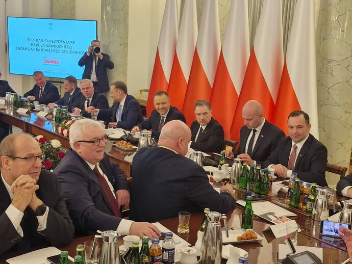 Dziś w Pałacu Prezydenckim odbyło się spotkanie Prezydenta RP Karola Nawrockiego z Komisją Krajową NSZZ „Solidarność”. Głównymi tematami rozmów były kondycja polskiej gospodarki, sytuacja pracowników w kluczowych branżach oraz współpraca pomiędzy głową państwa a Związkiem. Spotkanie miało szczególny wymiar – odbyło się niemal w pierwszą rocznicę podpisania porozumienia programowego pomiędzy ówczesnym kandydatem na prezydenta Karolem Nawrockim a Komisją Krajową NSZZ „Solidarność”.